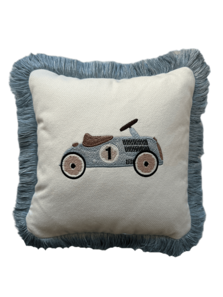 RETRO KIDS No 1 - ponadczasowa poduszka z haftowanym retro autkiem, wykończona ozdobnym frędzlem, która oddaje ducha klasycznych wyścigów. Idealna dla małych marzycieli kochających prędkość i styl. Dostępna również z frędzlem w odcieniach karmelu.